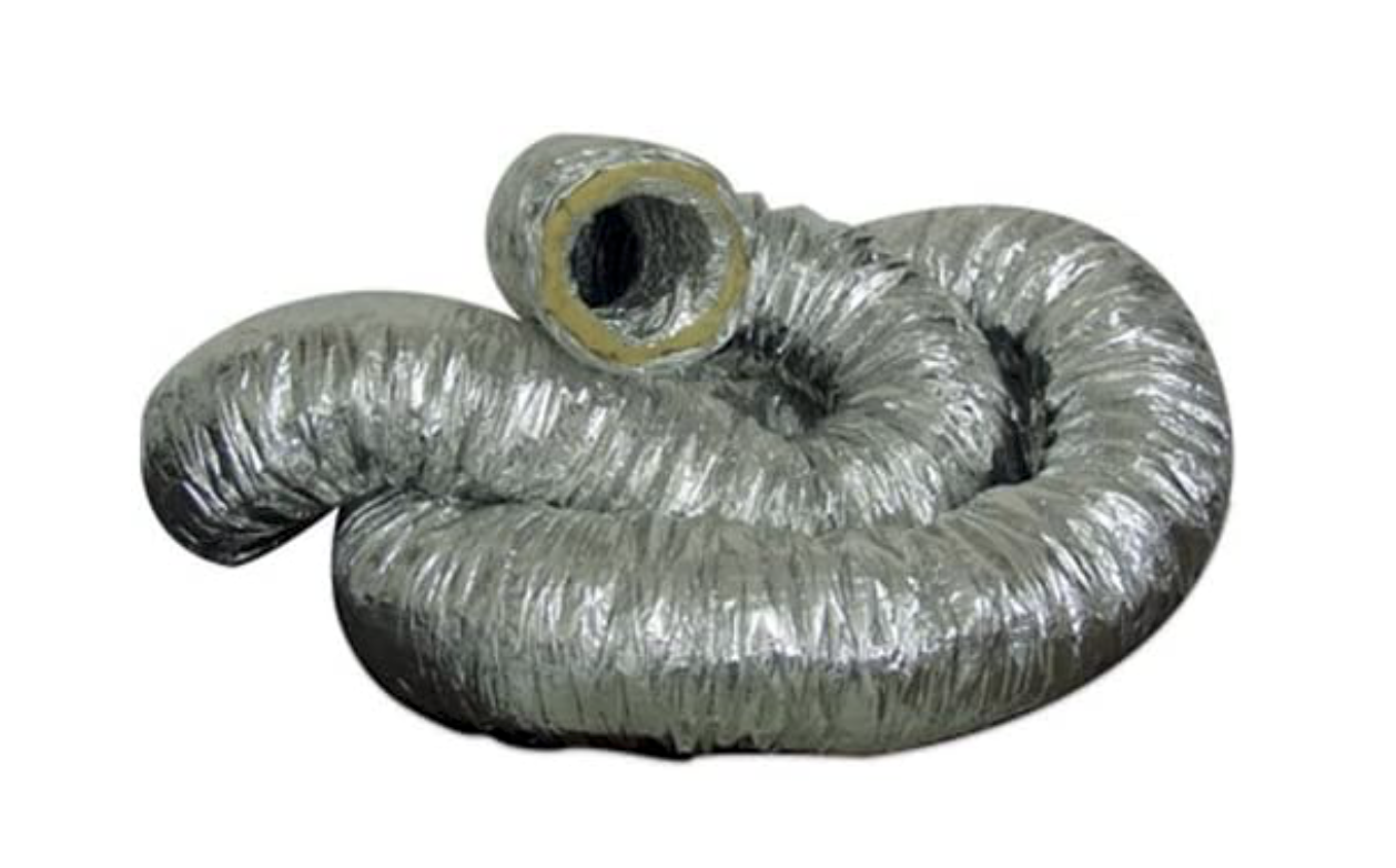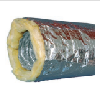 Conducto compuesto de superflexible aluminio con aislante térmico de 25 mm. de fibra de vidrio, densidad 16 Kg/cm³ y barrera vapor con complejo de aluminio reforzado. Resistencia al fuego M0-M1 No inflamable